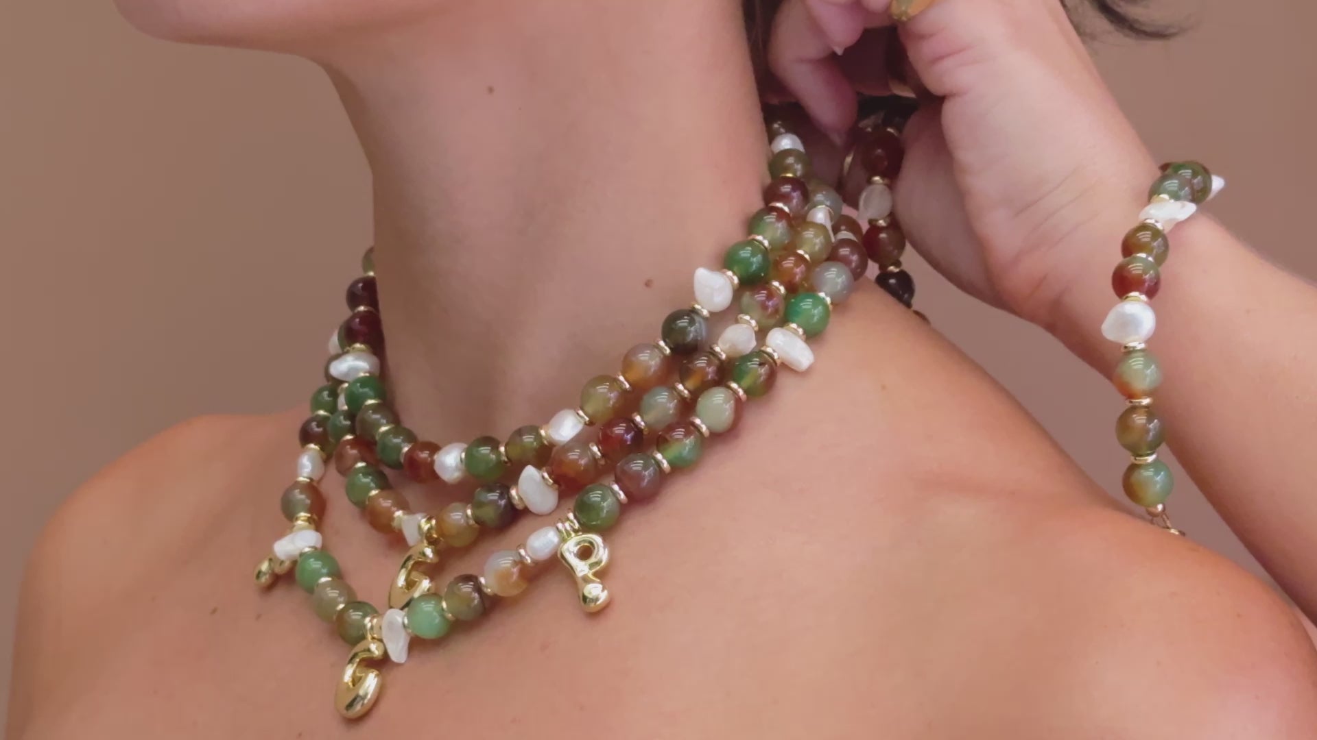 Rich peacock agate beads meet scattered freshwater baroque pearls, each one unique, paired with gold-filled spacer beads. Hand-beaded slowly and intentionally, this necklace is earthy but elevated. We're naming this our statement neutral.